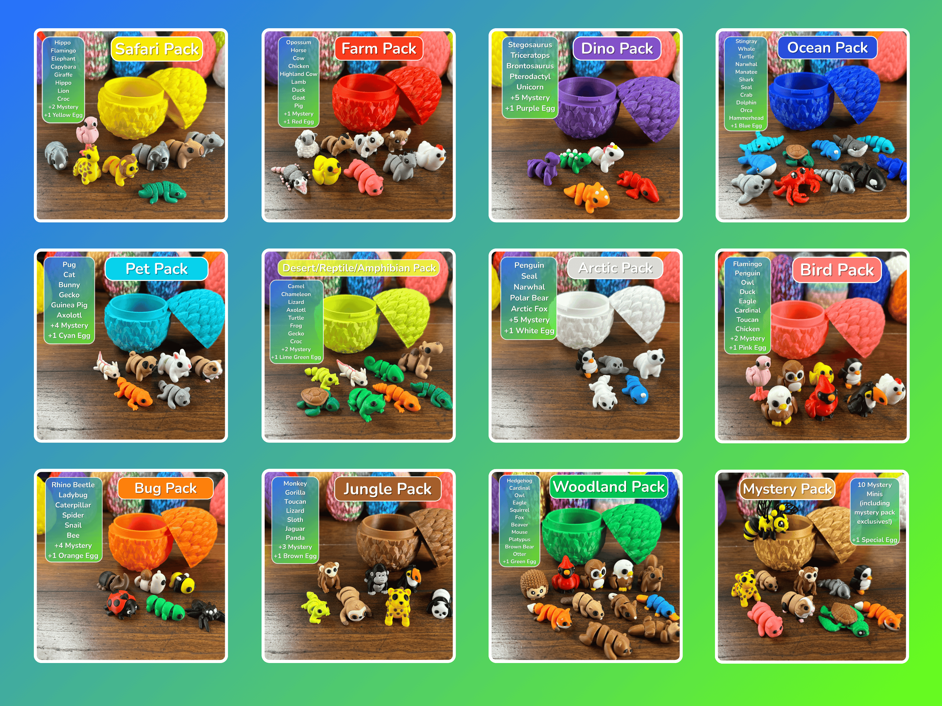 For example, the Bird 10-Pack contains 7 bird minis and the remaining 3 minis are randomly chosen. The Arctic 10-Pack contains 5 Arctic minis plus 5 random minis. Other themes like the Ocean 10-Pack and Woodland 10-Pack contain all ocean-themed and woodland-themed minis respectively. Packs may change as we expand our catalog. See below for individual pack details.